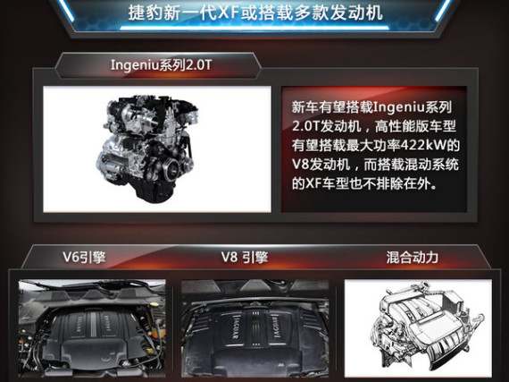 动力方面,捷豹XF初期有望继续搭载现款2.0L和3.0L V6、5.0L V8涡轮增压发动机作为主要动力来源。随后将搭载全新开发的Ingenium系列2.0升四缸增压引擎,这是捷豹路虎集团开发的拥有最灵活架构的引擎。其搭配的涡轮更可以灵活采用单涡轮增压、双涡轮增压甚至是涡轮与机械混合增压方式。同时,该引擎可以灵活的横置或纵置在引擎舱内,以满足与后驱或四驱系统的搭配。传动方面,捷豹第二代 XF 将有可能采用 ZF Friedrichshafen AG 全新的 9 速自动变速箱。另外高性能版XF有望搭载最大功率422kW的V8发动机,而搭载混动系统的XF车型也不排除在外。(网通社 2014年10月12日 北京报道)