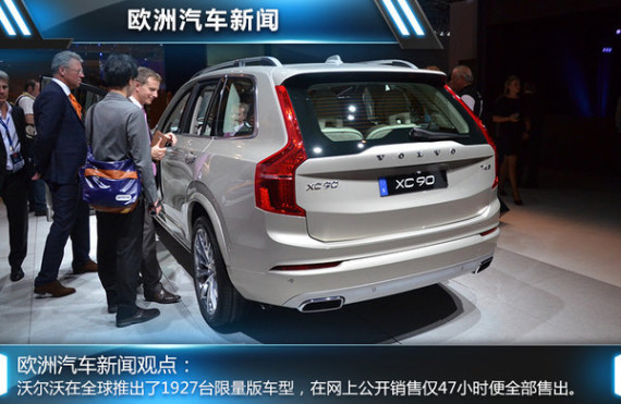 欧洲汽车新闻是欧洲当地的权威汽车媒体,在重大车展上均会进行专业报道,同时对车企领导采访。此次巴黎车展上,该媒体对沃尔沃的网络销售给予了高度赞赏:沃尔沃在全球推出1927台特别版XC90S,在网上公开销售仅47小时后便全部售出,在高峰时间曾出现每分钟售出七辆车的记录。
