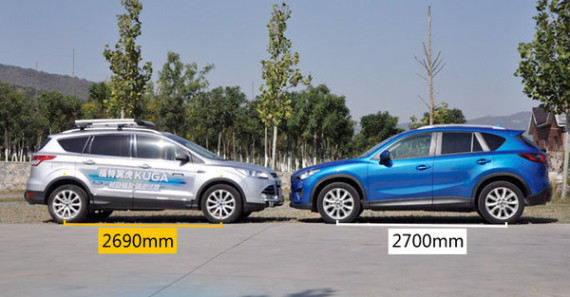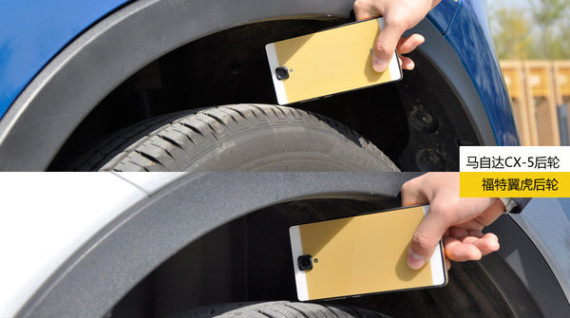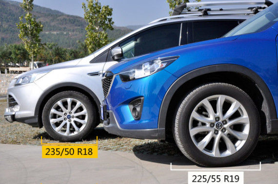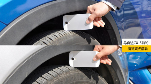 经过数据对比,两款车型在车身高度上仅相差15mm,但两款车型的轮胎与轮眉的间距有很较大的区别,其中马自达CX-5采用了225/55 R19型号轮胎,明显比翼虎大上一圈。但经过实际对比数据却截然相反,马自达CX-5的前轮间距明显要大于福特翼虎,而后轮两者的间距基本保持一致,以运动性来考量上述两款车型,马自达CX-5有明显的优势。