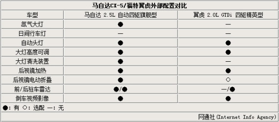 对于同价位的两款车型,在外部配置上有略微的差距,其中马自达CX-5车型配备了前/后驻车雷达/倒车视频影像以及无钥匙进入等功能,相比福特翼虎多出了后视镜电动折叠、氙气大灯、前驻车雷达三大主要功能,上述功能在实际使用当中都很实用,足以看出其性价比的出众。