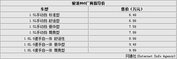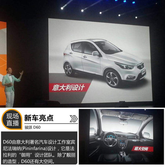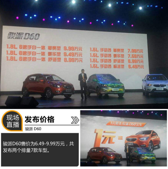 天津一汽全新品牌骏派的首款“大作”骏派D60此前已经在车展多次亮相。10月27日该车终于在北京万事达中心发布上市。这款天津一汽定位小型SUV的全新车型,也将成为天津一汽进军全新细分市场的崭新开端。发布会现场,一汽官方宣布这款小型SUV的售价为6.49-9.99万元。新车推出1.5L和1.8L两个排量共7款车型,匹配5速手动和6速自动变速箱。