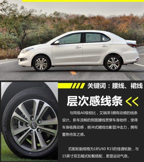 从车身侧面造型来看,艾瑞泽3采用高腰线的设计,笔直的腰线连接前后大灯,使车辆看上去更加修长。轮胎规格为185/65 R15的佳通轮胎,匹配双五幅15英寸铝合金轮毂,彰显出十足的运动感。