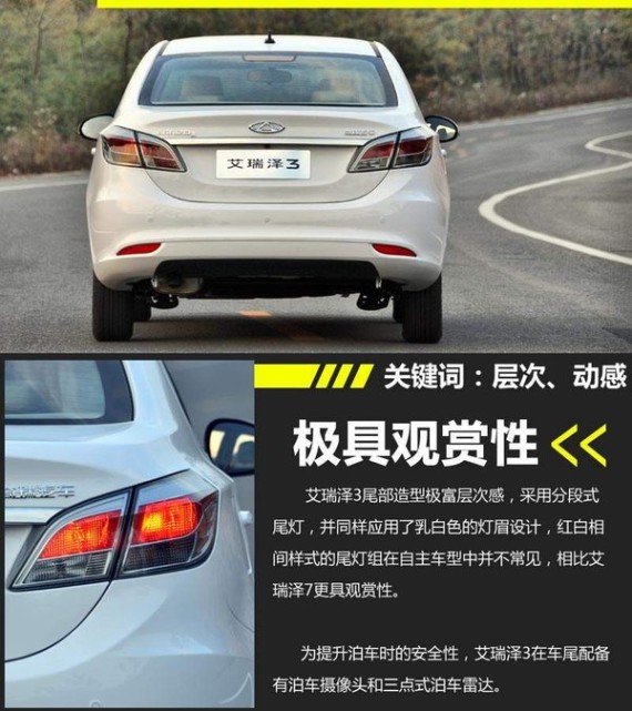 在尾部造型上,艾瑞泽3采用与前大灯相同的乳白色灯眉,配合红白相间样式的分段式尾灯,这样的设计在自主车型中并不常见,相比艾瑞泽7更具观赏性。同时车尾配备的三点式泊车雷达和泊车摄像头,有效提升了泊车时的安全性。