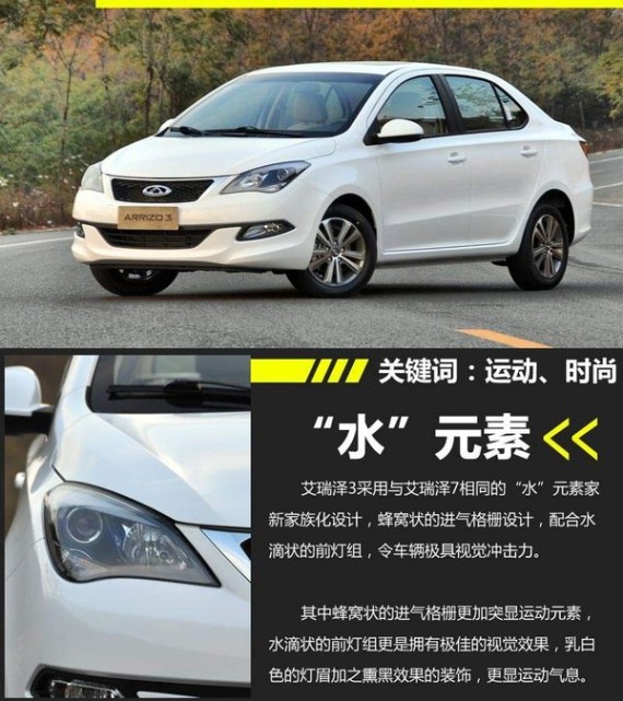 在外观设计上,艾瑞泽3采用与艾瑞泽7相同的“水”元素家族化设计,蜂窝状的进气格栅设计,配合水滴状的前灯组,令车辆极具视觉冲击力。此外,前进气格栅与下进气口的设计极具层次感,整体搭配十分得体。