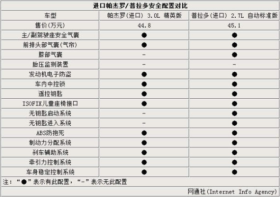 作为一款纯粹越野SUV,进口三菱帕杰罗3.0L精英版在安全性配置方面自然毫不含糊,多达10项。主/副驾驶座安全气囊、前排侧气囊、ABS防抱死、制动力分配、刹车辅助系统以及发动机电子防盗等常规安全配置一应俱全,足以为带来安全保障。进口普拉多2.7L自动标准版则在此基础上“锦上添花”,多出无钥匙启动系统等3项配置。