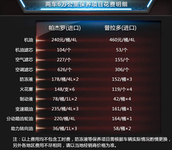当新车行驶里程达到6万公里时,随着需要更换的配件越来越多,以及各品牌4S店工时费的不同,两车的保养费用也出现差异,由于进口帕杰罗工时费相对较低,因此,该车保养价格相对进口普拉多要低近4000元。同时,4S售后人员还建议,三车每5000公里或6个月进行一次保养可较好保持车辆各方面性能。