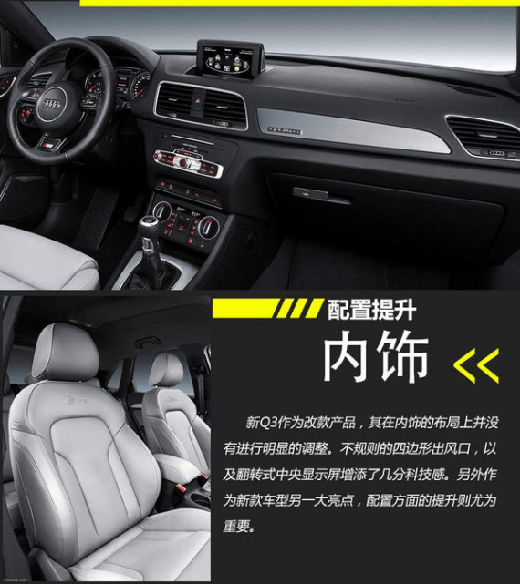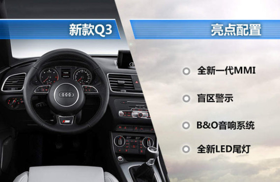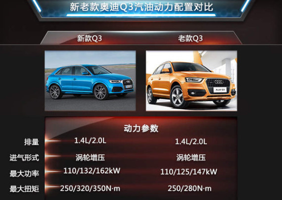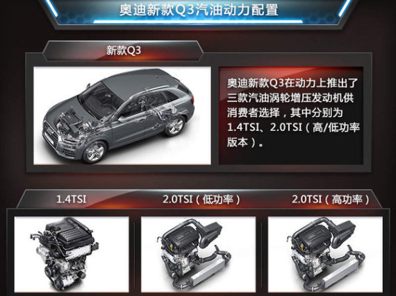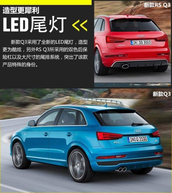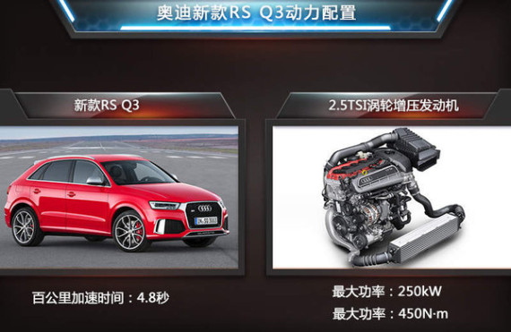 在动力方面的升级是新款Q3系列产品最大的变化之一,其中目前普通版新Q3搭载了1.4TSI和2.0TSI(高/低功率)三款动力参数不同的发动机。2.0T发动机作为该系列产品的主销车型,高/低功率两款发动机的最大功率为132kW和162kW,相比老款车型在这一数值上有大幅提升。另外新款RS 30搭载了2.5TSI涡轮增压引擎,最大功率达到了250kW,峰值扭矩则为450N·m,使该款产品的百公里加速时间仅为4.8秒。(网通社 2014年11月10日 北京报道)