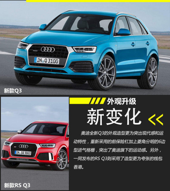 奥迪定位在紧凑型SUV市场的Q3已在中国投产并销售,并取得了较好的业绩数字。以今年前三季度的数据为例,奥迪Q3 (配置|询价)在华共销售6.38万辆新车,占一汽奥迪总销量的17%。而近日奥迪正式公布了新款Q3和RS Q3的官方图片,其相比老款车型而言更具现代感。另外在动力方面也搭载了经过重新调校的增压引擎,使动力表现得到提升。