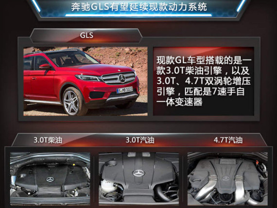动力方面,现款GL车型搭载的是3.0T和4.7T双增压汽油发动机,最大功率分别为245kW和320kW,还有一款3.0T柴油发动机,最大功率190kW。传动方面匹配的是7速手自一体变速器。未来奔驰GLS车型或将延续现款的动力总成,并进行重新调校,在性能参数上有望进一步提升。