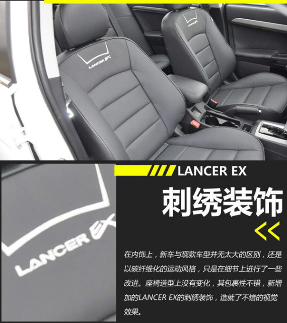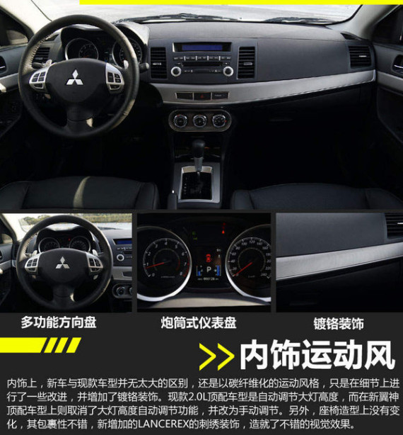 在内饰上,新车与现款车型并无太大的区别,还是以碳纤维化的运动风格,只是在细节上进行了一些改进,并加入了镀铬装饰。现款2.0L顶配车型是自动调节大灯高度,而在新翼神顶配车型上则取消了大灯高度自动调节功能,并改为手动调节。另外,座椅造型上没有变化,其包裹性不错,新增加的LANCEREX的刺绣装饰,造就了不错的视觉效果。