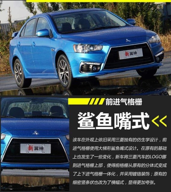 新翼神实际上即为现款翼神的改款车型,该车在外观上依旧采用三菱独有的仿生学设计,前进气格栅使用大梯形鲨鱼嘴式设计。在原有的基础上也发生了一些变化,新车将三菱汽车的LOGO挪到进气格栅上部,使得前格栅从原有的分体式变成了上下进气格栅一体化,并采用镀铬装饰;原有的细密竖条状也改为了横幅式,显得更加夸张。