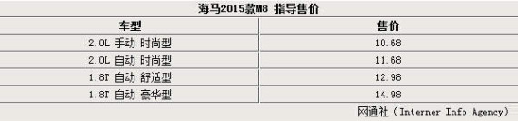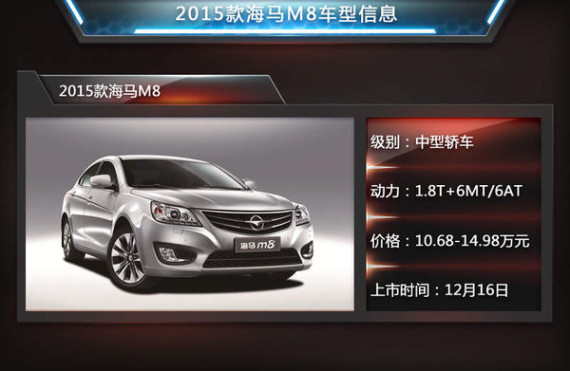 据了解,2015款海马M8的车身尺寸与现款车型完全一致,长宽高分别为4845/1830/1475mm,轴距为2800mm,这样的数据显然已经达到了目前市场中主流B级车的水准。待该车正式投放市场后,将会主要面对以奔腾B70、吉利EC8为首对标车型的挑战。