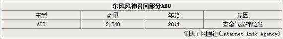 A60是东风风神旗下一款主力轿车,该车型于2012年3月28日与国内消费者见面,随后于2013年被权威机构J.D.Power亚太公司评为自主品牌车型安全质量榜首。近日,国家质检总局官方网站公布,因安全气囊存在隐患,东风风神将召回部分2014款A60轿车。据统计,将有2,848辆车受到影响。