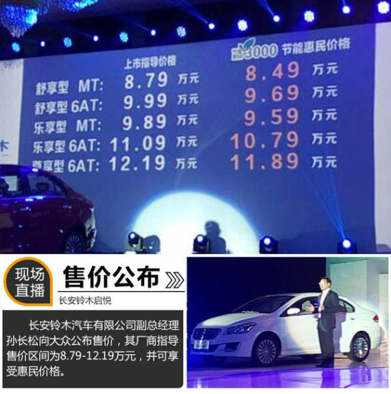 长安铃木在沉寂多年之后,于今年广州车展发布了旗下全新A级轿车-启悦。伴随着2014年即将进入尾声,长安铃木也正式推出启悦与消费者共同迎接新年。今日,长安铃木启悦在海南三亚正式上市,共发布了包括手动舒享型、自动舒享型、手动乐享型、自动乐享型及自动尊享型在内的5款车型,均搭载1.6L发动机,其售价区间为8.79-12.19万元。