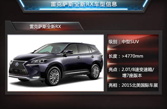 雷克萨斯RX在今年推出了RX270特别版车型,全国限量销售1200台,而新车与老款相比并无明显的变化。随后在各大厂商纷纷对旗下车型进行更新换代的时候,雷克萨斯意识到RX这款中型SUV也应进行大整改以在细分市场中立足。近日,海外媒体worldcarfans透露,雷克萨斯全新RX将在车身尺寸方面进一步优化,同时将以8速变速箱代替目前6速的传动系统,预计在2015年举行的北美国际车展上正式亮相。