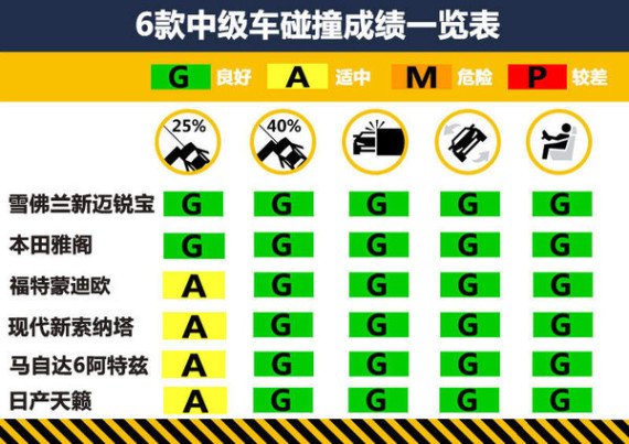 参加碰撞测试的6款中级轿车均为美规车型,分别是2014款雪佛兰迈锐宝、2014款本田雅阁、2013款福特蒙迪欧、2015款现代索纳塔、2014款马自达6阿特兹以及2013款日产天籁。(新款迈锐宝和新款索纳塔有望今年国内上市)IIHS碰撞测试共包含正面25%碰撞、正面40%碰撞、侧面碰撞、顶部碰撞和颈部保护5大项考核内容,其中后4项是较为温和的测试项目,本次参试的6款车型全部拿到了最高评价“G”(良好)。而在最严苛的正面25%小面积碰撞中,6款中级车则分出高下,首先从总评上看,新迈锐宝和雅阁,拿到最高评级;而蒙迪欧、新索纳塔、马自达6阿特兹(后文简称阿特兹)和天籁,单项总评成绩则是“A”(适中)。(注:在美国参加测试车型的最终碰撞成绩仅供国内消费者参考)