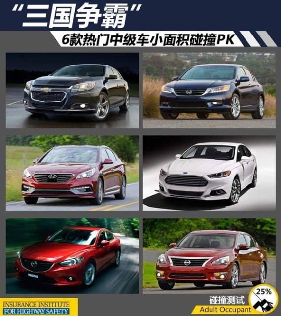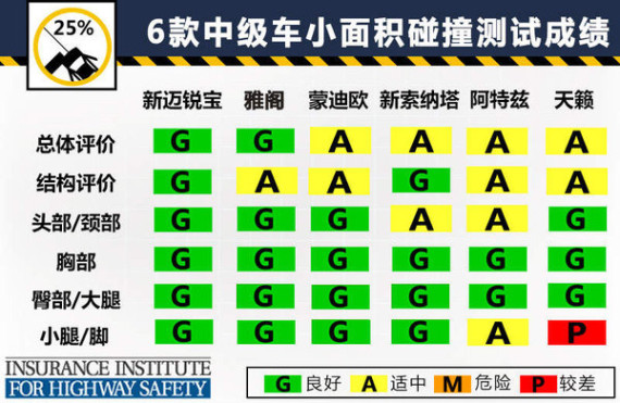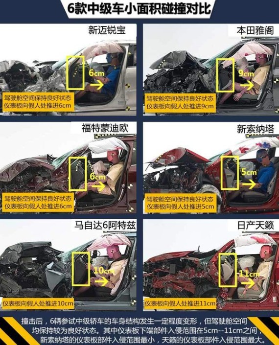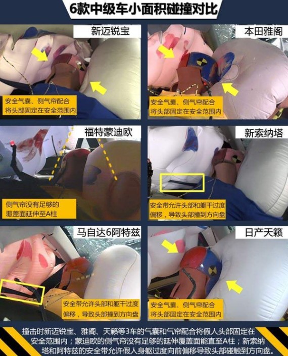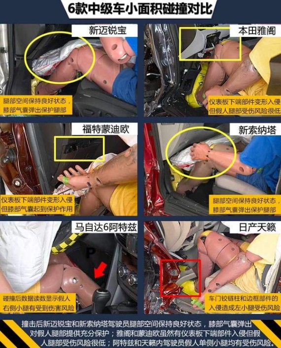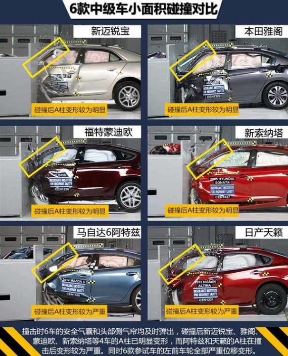 从以上6款热门中级车在IIHS严苛的小面积碰撞测试中我们可以看出,美系的雪佛兰新迈锐宝表现最佳,从2014款起,此车对前部吸能结构和车门边框部件进行改进以提高安全性能,在严苛的小面积碰撞中拿到最高成绩,保障了车内乘员安全。日系畅销车型本田雅阁,在这项测试中也有良好的表现,此车采用本田G-CON安全碰撞技术和ACE高级兼容车身设计,在这次考核中取得较为优秀的成绩,能够在严苛的碰撞测试中对车内乘员提供充足的防护。另一款美系车型福特蒙迪欧,虽然总评和结构项成绩没拿到最高分,但4项乘员安全项全部获得最高评价,在小面积测试中车内乘员安全得以保障。韩系现代新索纳塔,在这项严苛测试中对驾驶员头部的防护还有进一步提升的空间。日系的马自达6阿特兹测试中模拟驾驶员假人的头部和腿部安全项被扣分,而日产天籁则更是乘员小腿/脚单项成绩只拿到“P”(较差),这两款车型对车内乘员的安全防护有待加强。
