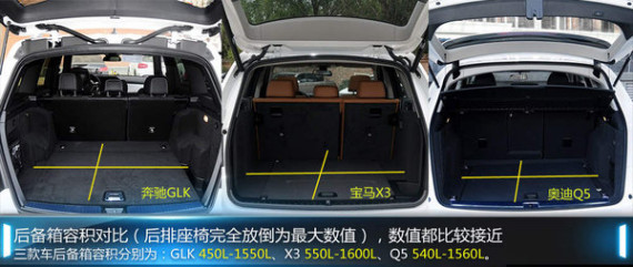 车身尺寸方面,宝马X3由于添加的运动套件,因此在长度和高度上有所差异。奔驰GLK的长宽高分别为4556/1840/1689mm,轴距2755mm,虽然与其他两款车型相比并没有优势,但作为一款定位中型的豪华SUV,驾乘空间比较宽敞,而宽度的减小也为GLK带来更好的稳定性和通过性。同时,这三款SUV在储物空间方面表现都比较出色,X3的后备箱空间最大,达到550升,后排座椅完全放到后,容积可以达到1600升。