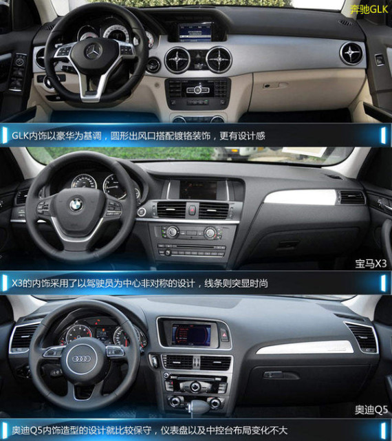 内饰方面,奥迪Q5的内饰保持了家族式的内饰设计,并没有更多新意,但整体营造出的成熟稳重的氛围。宝马X3则是简洁大气的风格,无论内饰材质和做工都符合了豪华车型的品质。奔驰GLK内饰所传递的设计感比其他两款车型要复杂得多。复古的圆形出风口是亮点之一,整个内部更显精致时尚。三幅式多功能方向盘采用金属材质装饰,集合了电动调节、定速巡航、换挡拨片等功能按键。中控布局更加人性化,彩色液晶大屏镶嵌其中,分区空调等控制按钮排列整齐。