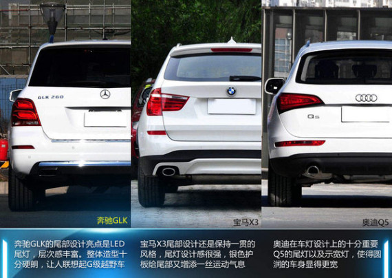 这三款车的前脸部分大体上都延续了各自品牌一贯的设计,GLK在设计线条上给人的视觉改观较大,以硬派形象出现,前卫而时尚;宝马X3凸显大气,前大灯与格栅相连,设计感更强;奥迪Q5比较中规中矩,车型略显圆润。GLK侧面的设计与X3、Q5传统的SUV设计思路不同,偏向硬朗的线条、更大面积的车窗以及平直化的轮眉,融合了G级越野车的硬汉风格。车尾部分,奥迪Q5采用与车头呼应的圆润设计;宝马X3的尾灯、示宽灯、银色护板以及不同线条共同突出了运动风格;GLK则比较干练,层次感丰富的尾灯,更大面积的后窗以及镀铬装饰条,使得车尾更加立体。