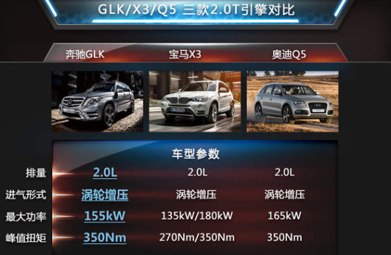 在对比了车型设计和动力性能之后,我们还是来着重分析一下这三款车型的配置方面的情况。为了公平竞争,我们选择了三款同为2.0T引擎,且售价比较接近的三款车型,分别为奔驰GLK 260 4MATIC 时尚型 极致版、宝马X3 xDrive20i 领先型 、奥迪Q5 40 TFSI 技术型,三车从价格来看奔驰GLK有一定优势,配置是否也能如此。