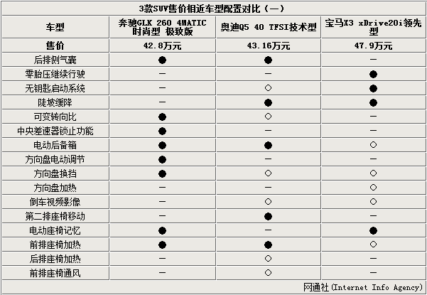 这三款豪华SUV车型都配备了包括前后气囊、胎压监测等安全性配置,全景天窗、中控彩色大屏、电动座椅调节等舒适性配置,以及启停技术、车载互联娱乐系统等先进的科技配置。除此之外,由三款对比车型可以明显看出,奔驰GLK拥有方向盘电动调节、转向头灯、自动泊车、防炫目后视镜等等,而这些在X3、Q5上并没有装备。另外,得益于产品的国产化,产品价格更低,综合考虑下GLK相比其他两款产品更具有优势。