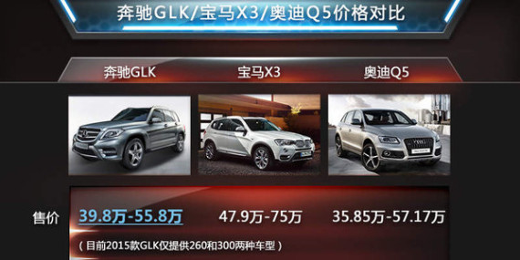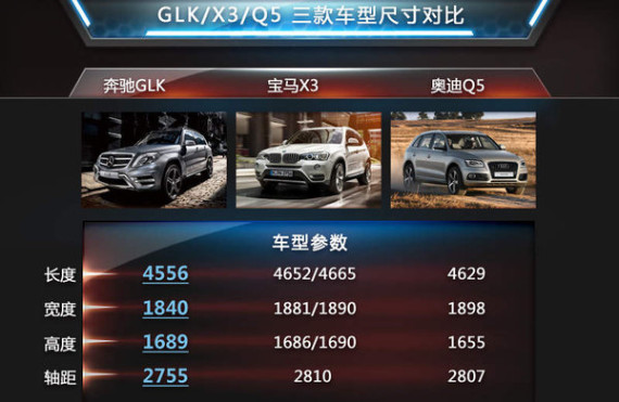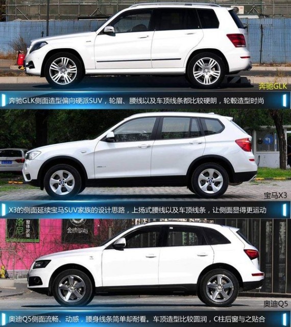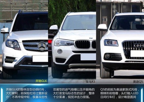 在中国市场中奔驰、宝马、奥迪作为德系豪华品牌的三剑客,产品涉及各个细分领域,既是行业领头也是直接竞争对手。而面对国内十分火热的中型SUV,三大品牌旗下推出的GLK、X3和Q5,自然成为这一市场的主力车型。这三款热销SUV也展开了激烈的较量,那么到底在这一售价区间内,谁的性价比更高,下面我们为您进行一次全面对比,从车型设计到动力性能,以及产品的配置逐一分析。