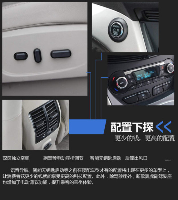 新款翼虎内饰依旧采用经典的飞机驾驶舱设计,炮筒式仪表盘具有彩色液晶屏,极富科技感。看的到的最大变化是全新升级的座椅。座椅的厚度增加,包裹性也将进一步提升。除了座椅这一看的见的明显变化外,新款翼虎最大的变化是配置的下探。语音导航、智能无钥匙启动、双区独立恒温空调等之前在高配车型才有的配置将出现在更多车型上,让消费者花更少的钱就能享受更高的配置。