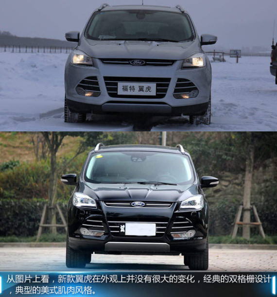 首先来看一下外观,从图片中款新老款翼虎几乎没有什么差别。家族式的前脸,狭长的透镜大灯,厚实的车身结构让翼虎看起来力量十足,动感的造型从车头贯穿至车尾,倒梯形的进气格栅、颇具立体感的发动机舱盖、大角度倾斜的前风挡,以及车顶行李架,这些都是翼虎主要的动感元素。