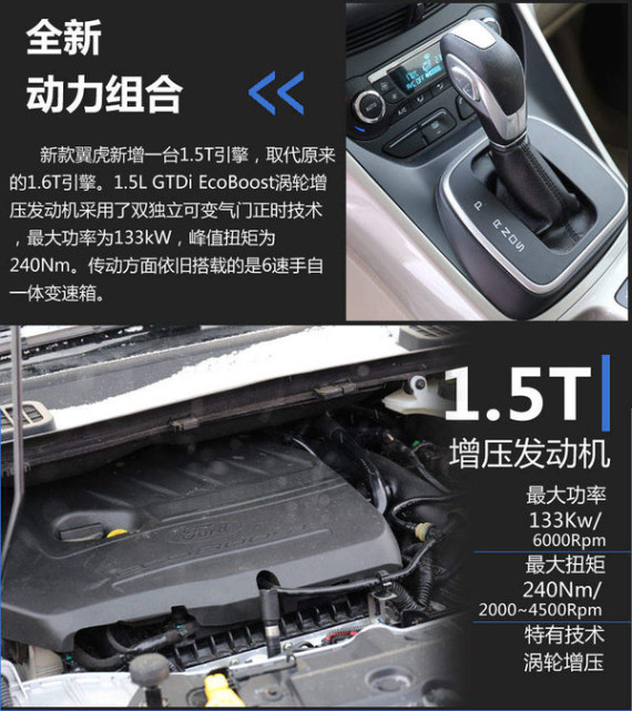 此次试驾体验车型是新款翼虎1.5T车型。它搭载的1.5T引擎最大功率为133kW,峰值扭矩为240Nm,与发动机匹配的是6速手自一体变速箱。目前这台国产引擎已经搭载在新蒙迪欧上,相较现款车型搭载的1.6T,1.5T引擎不管在动力还是燃油经济性上都要略胜一筹。值得一提的是新款翼虎全系标配了S/S智能启停系统。据长安福特公布的数据显示,1.5T车型百公里油耗仅需7.2L,较1.6T车型下降了0.3L。