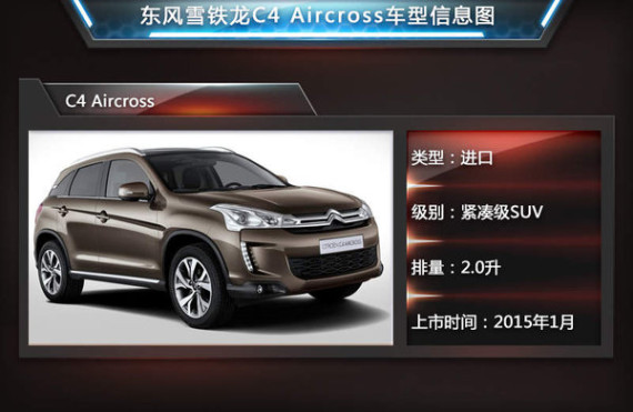 东风雪铁龙在刚刚过去的2014年表现抢眼,全年销售车辆突破32万辆,同比增长14%,增速超过行业平均水平。这样的成绩是在没有SUV车型的情况下取得的(C3-XR于2014年12月中旬上市)。伴随着SUV市场的快速增长,东风雪铁龙也希望在此领域取得更好的成绩。近日,东风雪铁龙官方透露:东风雪铁龙今年在整合进口车渠道后,引入的首款SUV将是C4 Aircross,该车也成为东风雪铁龙抢占SUV市场推出的第二款SUV车型。