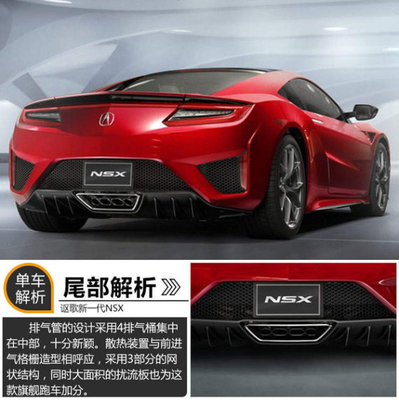 新车前脸类似U型设计,具有跑车的风范。进气格栅的设计别具一格,由不规则网状式的3部分组成。大灯依然保有讴歌品牌独特的设计风格,6颗灯珠组合而成的鹰眼式前灯给人以锐利的视觉冲击。尾部排气管的设计十分新颖,并没有放置在车尾两边,而是集中在中部,这样的设计就像四排气管镶嵌在保险杠之中。值得关注的是,尾部的散热装置与前进气格栅造型相呼应,同时大面积的扰流板也为这款旗舰跑车加分。