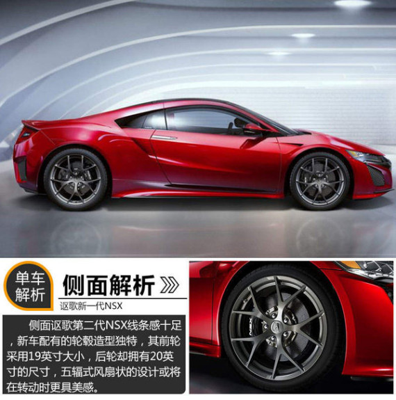 从侧面看,讴歌第二代NSX线条感十足。由于1215mm的车高使整车的重心略低,给人一种动力强劲的速度感。新车配有的轮毂造型独特,五辐式风扇状的设计或将在转动时更具美感。而且前轮采用19英寸大小,后轮却拥有20英寸的尺寸,这样不同的设计,有利于在行驶过程中保证最大的加速及动力。