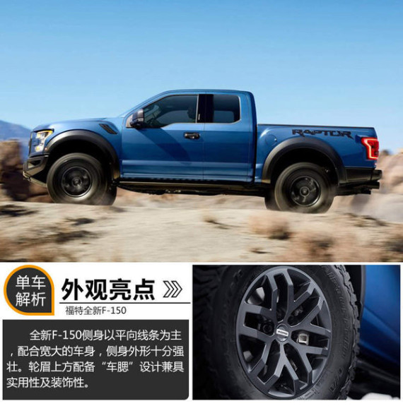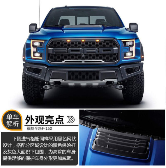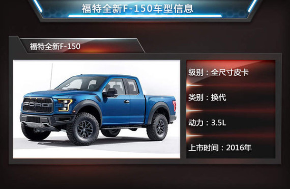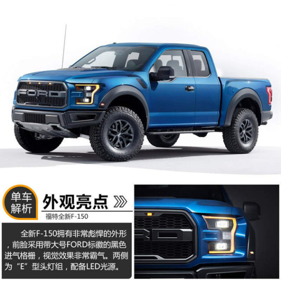 F-150是福特F系列皮卡产品中的最重要一员,曾连续37年成为全美最畅销的卡车,取得叫好又叫座的市场表现。全新F-150被福特称为“终极高性能越野皮卡”,相比现款车型增加了高强度钢和铝合金的用量,整备质量降低227kg,在动力性能和智能配置方面相比现款车型均有提升,将于2016年下半年正式上市。