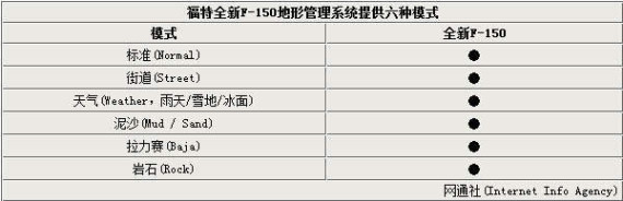 福特还为新车准备了一套与路虎类似的地形管理系统(Terrain Management System),提供六种切换模式。福特表示这套系统能够对动力系统、传动系统、牵引力控制系统、防抱死制动系统和AdvanceTrac车身稳定控制系统进行全面调节,以适应各种不同路面状况。全新智能系统、全新四驱系统及10速自动变速箱的使用,全新F-150将更加符合“终极高性能越野皮卡”的身份。