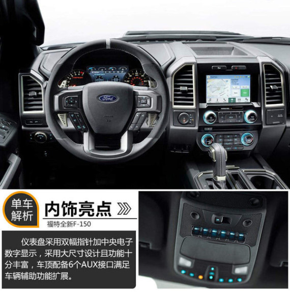仪表盘采用双幅指针加中央电子数字显示,采用视觉效果更加出色的大尺寸设计且功能十分丰富。新车驱动形式调节按钮设计在中控台左侧,车顶配备6个AUX接口满足车辆辅助功能扩展,驾驶舱一侧的车门集成的功能按键同样十分全面,这些细节处理均为全新F-150的内饰设计加分不少,更加契合皮卡车型注重实用性的设计理念。