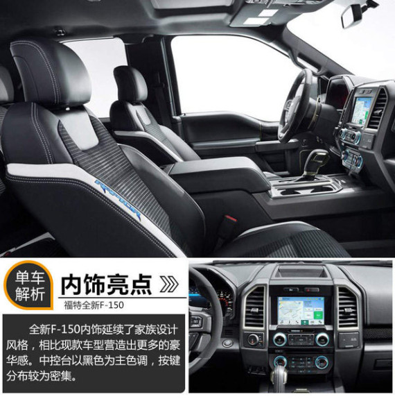 全新F-150内饰延续了家族设计风格,相比现款车型营造出更多的豪华感。中控台以黑色为主色调,按键分布较为密集,搭配方形分层次设计,视觉效果极具质感。换挡杆位置配有两个大尺寸圆形杯架,具有不错的实用性。新车采用四幅式多功能方向盘,采用真皮与翻毛皮搭配包裹手感更佳,功能按键尺寸较大操作更加方便,方向盘下方配备换挡拨片。
