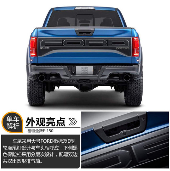 全新F-150侧身以平向线条为主,配合宽大的车身,侧身外形十分强壮。轮眉上方配备“车腮”设计兼具实用性及装饰性,后视镜方正宽大提供充足视野,电动蹬板经过重新设计更具质感,这些设计均为车身侧面造型增添了亮点。新车使用17英寸黑色合金轮毂配搭百路驰全地形KO2轮胎。车尾采用大号FORD徽标及“E”型轮廓尾灯设计与车头相呼应,视觉效果十分醒目。下侧黑色保险杠采用分层次设计,配黑双边共双出圆形排气筒,新车车尾造型奔放粗狂,具备十足的福特家族式肌肉风格。