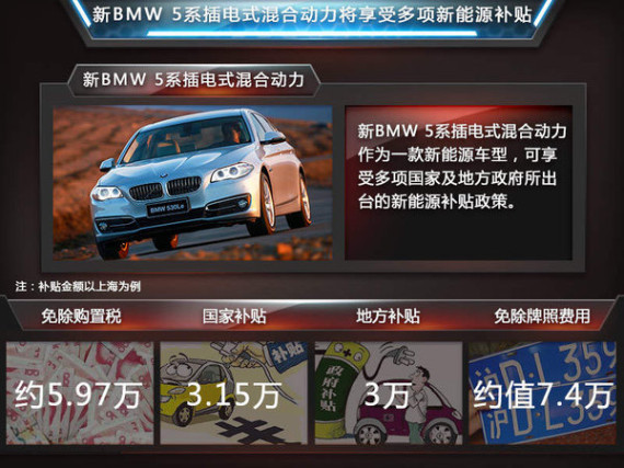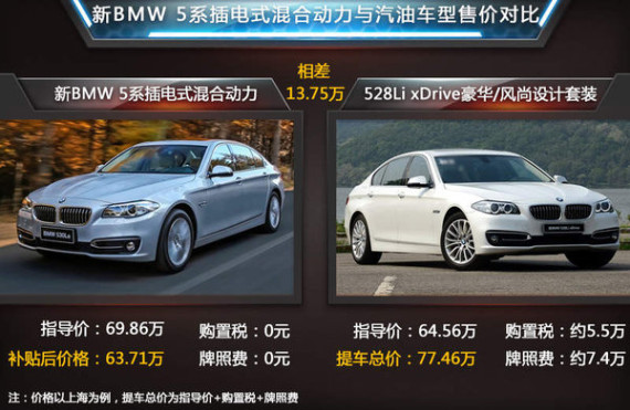 随着全球对于环境保护问题的大力支持,世界各地政府均推出了针对新能源车型的补贴政策,中国也不例外。根据目前国家对于新能源产品的扶持政策,新BMW 5系插电式混合动力上市后,可享受免除购置税(约5.97万元)和新能源汽车补贴(3.15万元)两项国家级政策扶持。另外也同时享受各地方政府对于插电混动车型的补贴政策,以上海为例,购买新BMW 5系插电式混合动力的车主还可申领3万元地方补贴,并且可以免除价值约7.4万元的汽车牌照费用。因此若新BMW 5系插电式混合动力的最终售价相比目前528Li xDrive豪华/风尚设计套装价格更低,并且前者购置税的减免以及在上海不需牌照费用等政策让该款产品竞争力更强,使得最终新车相比528Li xDrive豪华/风尚设计套装最终提车价格上优惠至少13.75万元左右。