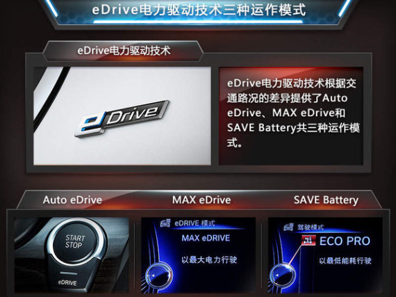 eDrive电力驱动技术根据交通路况的差异提供了Auto eDrive、MAX eDrive和SAVE Battery共三种运作模式,让车辆根据不同交通条件在混合动力或纯电动模式下运行。