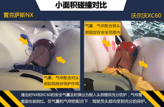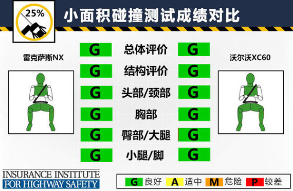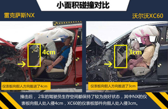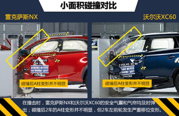 雷克萨斯NX在美国的这次碰撞测试中表现优异,包括在严苛的小面积测试在内,对车内乘员保护都非常到位,因此也获得 IIHS“2015最高等级安全评定+”(2015 Top Safety Pick+)。沃尔沃则被公众称之为“世界上最安全的汽车品牌”,XC60的碰撞测试同样优异,从这两款豪华SUV车型的成绩对比我们可以看出,雷克萨斯NX在碰撞测试中的安全性并不逊于沃尔沃XC60。