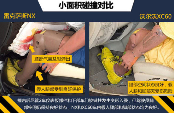 碰撞后雷克萨斯NX和沃尔沃XC60的驾驶员腿部空间均受到车门边框、铰链柱、仪表板下端部件等不同程度的变形后入侵,但腿部空间仍在基本安全范围内;同时NX装备的膝部气囊在碰撞中及时弹出发挥了防护作用,保护模拟驾驶员假人的膝部和小腿免受撞击到入侵结构而产生的伤害。而XC60虽然没有装备驾驶员膝部安全气囊,但撞击后良好的腿部空间保证了驾驶员腿部和脚部并无受伤风险。在这项测试中,这两款SUV车型在碰撞后车内乘员的腿部全部为良好状态。