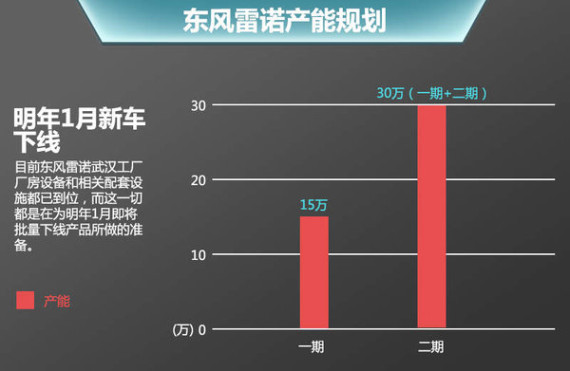 今年5月东风雷诺首款车型将投入试生产阶段,目前厂房设备和相关设备都已到位,而这一切都是在为明年1月即将批量下线产品所做的准备。据了解,东风雷诺项目规划为年产30万辆乘用车。一期工程年产15万辆乘用车及发动机能力,主要生产SUV、MPV产品。二期工程扩建年产15万辆乘用车及发动机能力,将有望拓展到轿车产品。