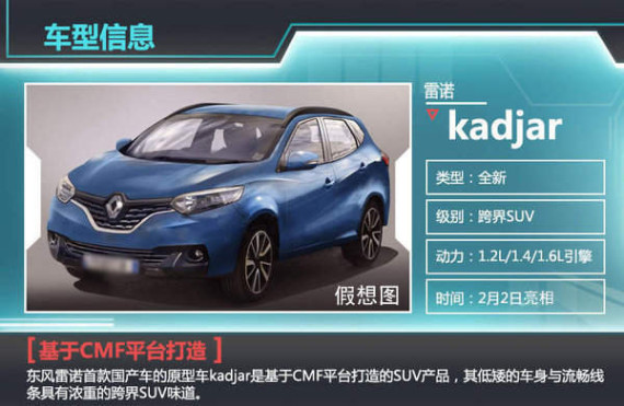 2014年,在雷诺集团全球10个主要市场中,9个市场份额得到了提升,包括乘用车和轻型商用车在内共销售了2,712,432辆,同比增长3.2%。而在中国市场,东风雷诺以进口车型为先导开拓市场,销量同比增长26%,达到33,425辆。面对巨大的中国乘用车市场,东风雷诺即将推出它的首款国产车型,雷诺中国销售市场高级总监兼东风雷诺销售市场部部长陈玮在接受媒体专访时表示:“2月2日在法国将会首发我们首款国产车的全球车型”作为雷诺的一款全球车型,这款SUV被命名为kadjar。根据东风雷诺相关规划,以kadjar为原型车的首款国产车型将于明年初正式上市,并会针对中国用户的习惯做出相应改变。“国产的东风雷诺SUV会比2月份亮相的原型车大一些”陈玮先生进一步补充道。
