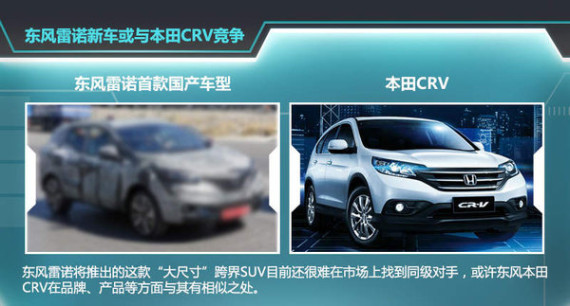 中国消费者对于大空间车型追求使得厂商推出的产品尺寸也越来越大,东风雷诺的首款国产车型也将针对中国用户做出相应调整。据陈玮先生透露:“国产的东风雷诺SUV会比2月份亮相的原型车大一些”,这项工作将由雷诺斥资5亿元人民币建立的本土化研发中心完成。没有特点的产品无法立足于竞争激励的SUV市场,东风雷诺将推出的这款“大尺寸”跨界SUV目前还很难在市场上找到同级对手,如果非要给它一个对手的话,或许东风本田CR-V在品牌、产品等方面与其有相似之处。