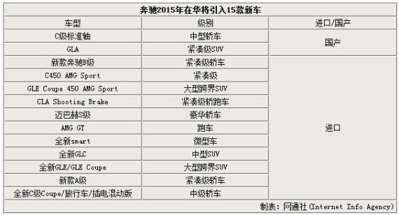 奔驰在过去的2014年,在华销量达到28.15万辆,同比2013年增长29.1%。在今年,奔驰在华将冲击30万辆的销售目标,对此新车引入的步伐将加快。近日,奔驰销售服务有限公司销售及市场营销执行副总裁段建军在接受媒体采访时表示:奔驰去年在华引入包括全新车型及改款车型共11款新车,今年将在华引入15款新车。其中国产GLA将在第一季度上市,全新的C级衍生车型,如旅行车也将陆续上市,而全新一代Smart将在下半年正式引入中国市场。多款新车的引入不但进一步丰富各个细分市场,同时也将刺激整体销量的提升。
