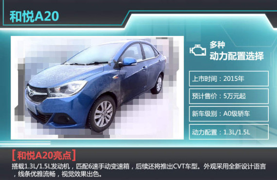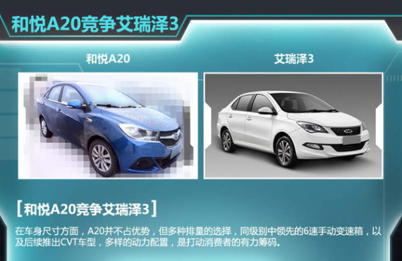 定位A0级家用车市场的和悦A20,其主要竞争对手是主流车型艾瑞泽3。虽然其车身尺寸与艾瑞泽3相比还有差距,但多种排量的选择,同级别中领先的6速手动变速箱,以及后续推出CVT车型,均是打动消费者的有力筹码,供消费者选择的余地也更多。
