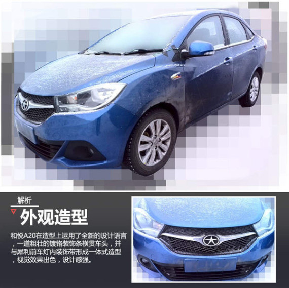 和悦A20在造型上运用了全新的设计语言,一道粗壮的镀铬装饰条横贯车头,并与犀利前车灯内装饰带形成一体式造型,视觉效果出色,设计感强。前保险杠中央还运用倒梯形设计,与U型蜂窝状进气格栅相呼应,简单大气。A20车身侧面线条造型流畅,使得其风阻系数仅有0.26Cd,车身侧面俯冲架势的腰线贯通到尾灯,简洁而不失饱满。