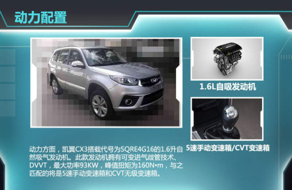 动力方面,凯翼CX3搭载代号为SQRE4G16的1.6升自然吸气发动机。此款发动机拥有可变进气歧管技术、DVVT,最大功率93KW,峰值扭矩为160N?m。与之匹配的将是5速手动变速箱和CVT无级变速箱,此套动力总成节油效果明显,百公里综合油耗仅为6.7L。
