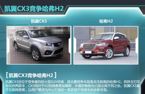 凯翼CX3定位于竞争激烈的小型SUV市场,其主要竞争车型是关注较高的哈弗H2。同样主打年轻化的两款车,CX3相对于H2的线条更加硬朗,外置的备胎也凸显出其不同之处。追求个性的年轻人要的并不只是靓丽的外表,对新鲜事物的追逐更能彰显自己的不同,凯翼CX3基于互联网思维,以用户需求为中心打造的一款区别于传统的全新车型。依托于瑞虎3的价格定位,CX3的售价上下浮动并不会太高,较哈弗H2相比,价格优势明显。
